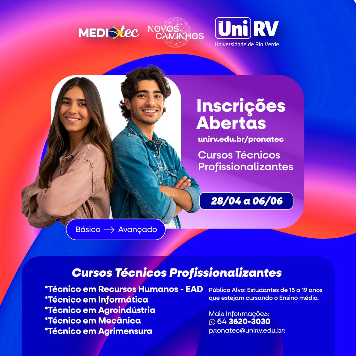 A UniRV - Universidade de Rio Verde, dando prosseguimento às ações do Ministério da Educação, abre 220 vagas para os cursos Técnicos Profissionalizantes - CONCOMITANTE, na modalidade: educação presencial e educação à distância. A oferta faz parte do Programa PRONATEC do MEC e é totalmente gratuita!