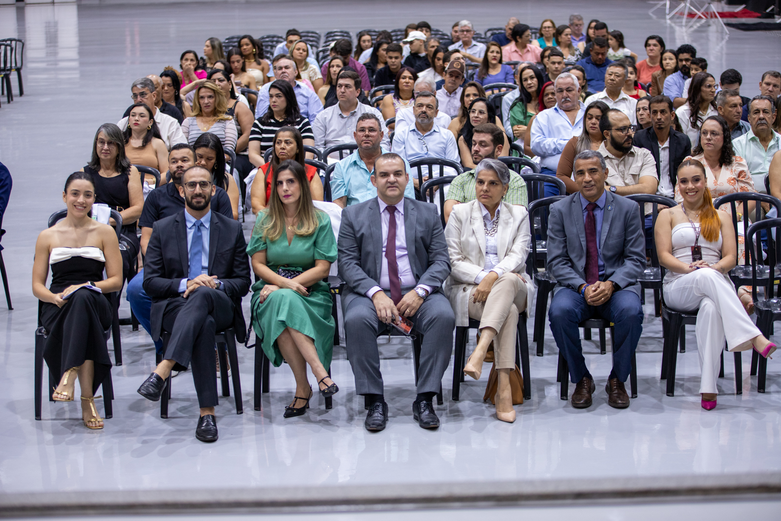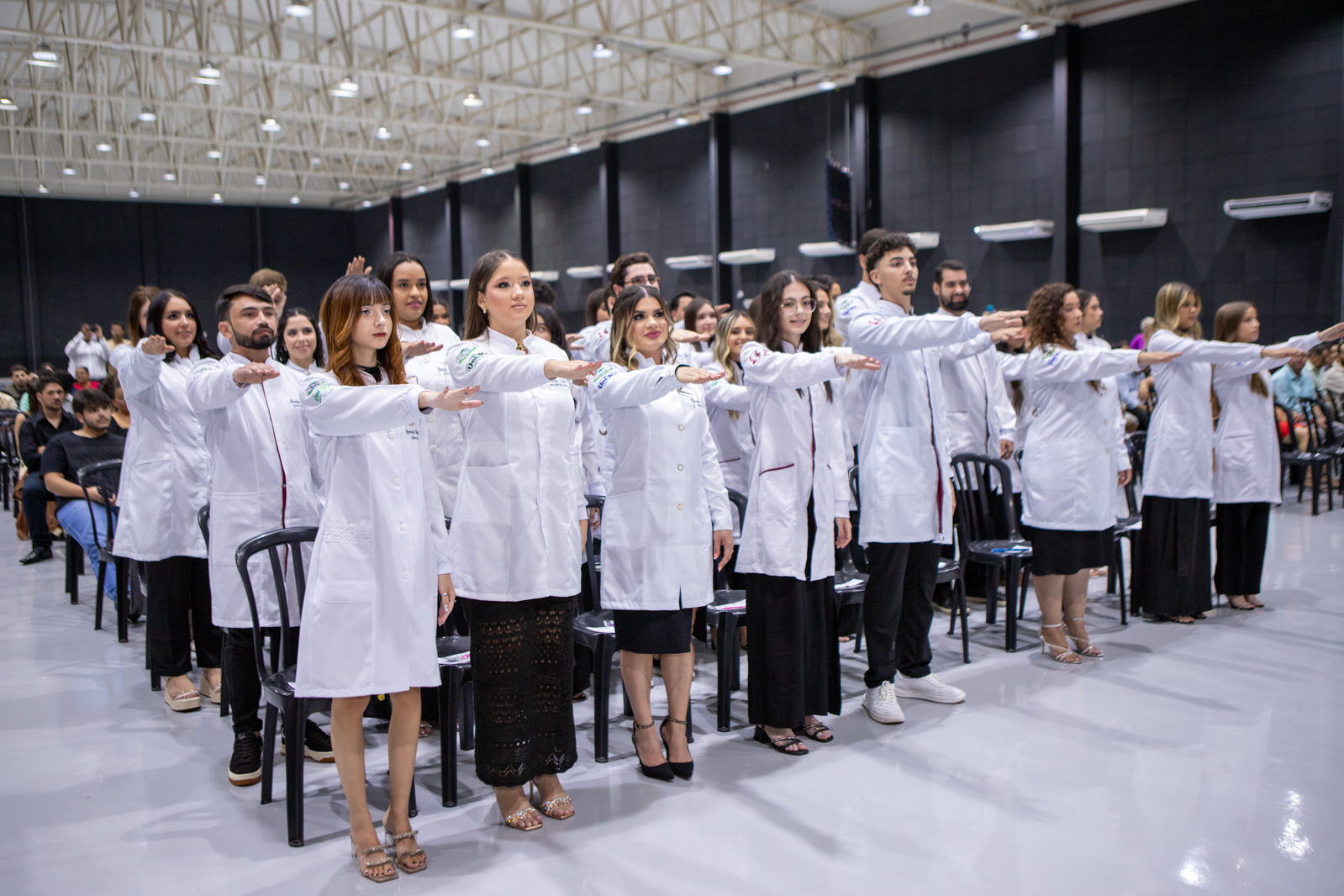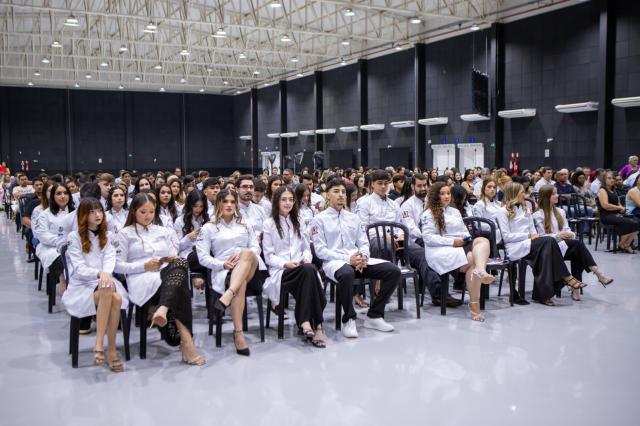 Famílias, professores e autoridades da Universidade acompanharam o momento em que os calouros receberam o jaleco, símbolo da responsabilidade, da dedicação e da vocação para o cuidado com o outro.