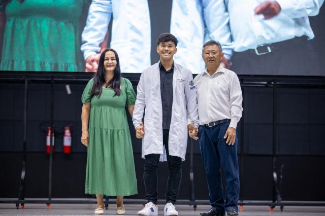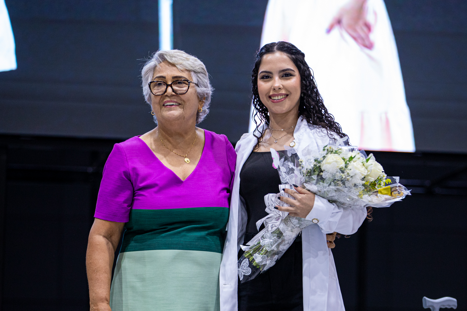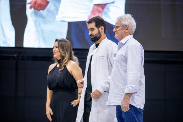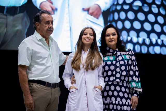 Após os discursos, os familiares subiram ao palco para vestir os jalecos nos calouros, em um gesto simbólico de amor, confiança e apoio.