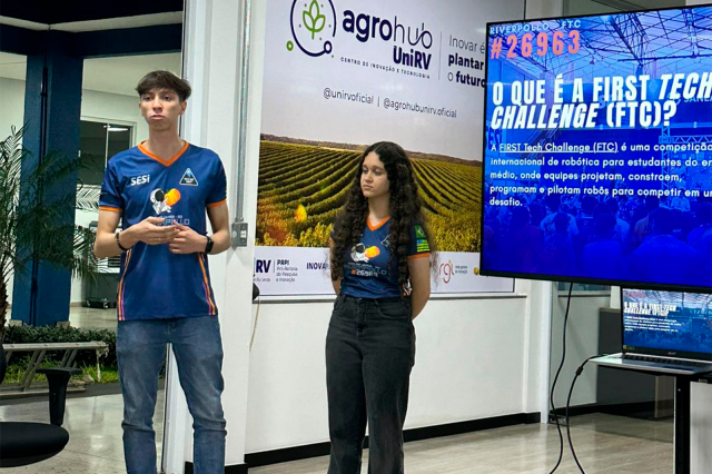 A palestra foi conduzida por professores do SESI/SENAI, Morgana e Ruan, acompanhados de alunos do Ensino Médio, integrantes da equipe competitiva Riverpolo, reconhecida pela participação em torneios de robótica.